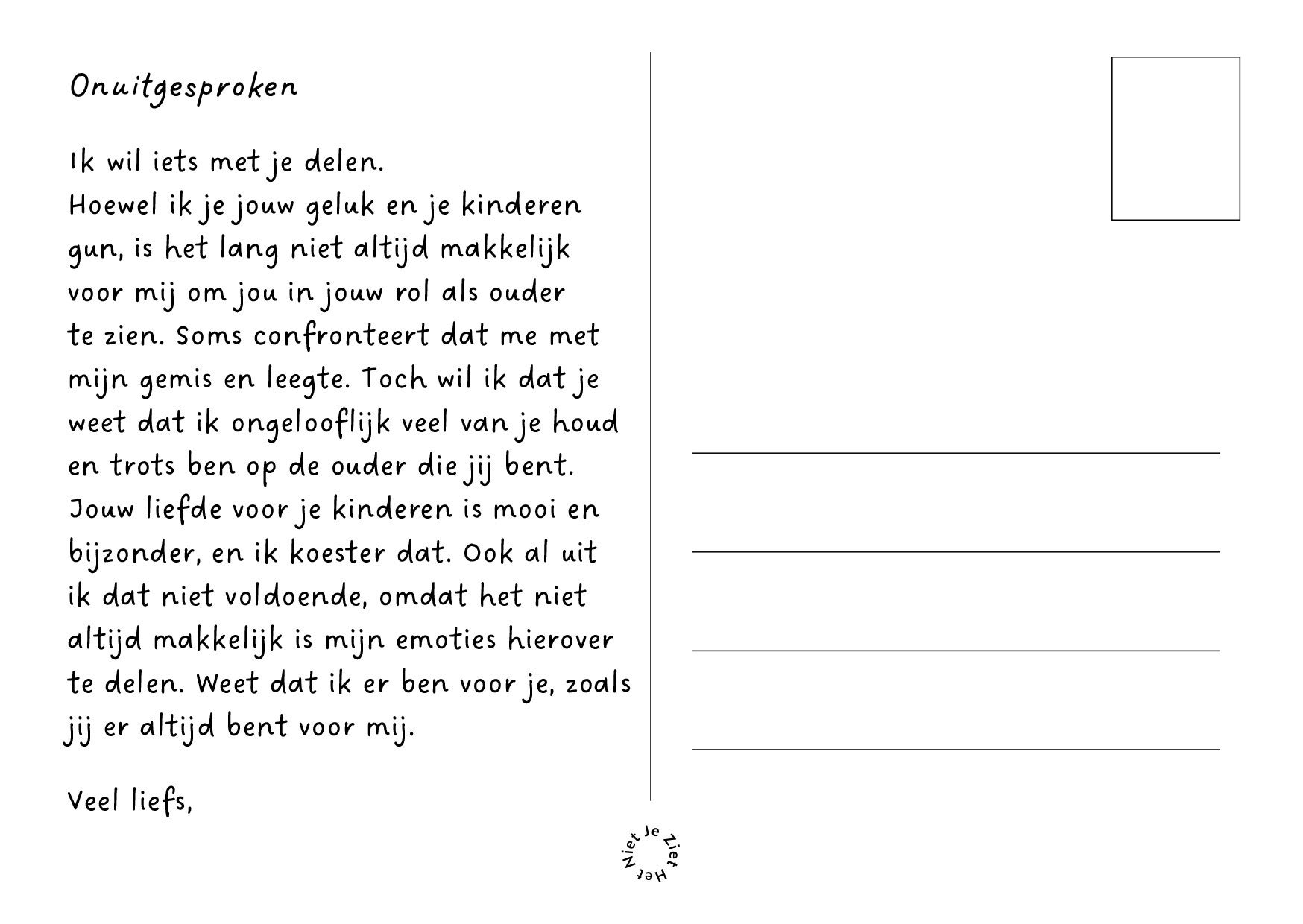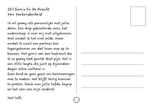 💌 Hiervoor hebben wij een aantal (voorbeeld)kaarten ontwikkeld die je naar een geliefde kunt sturen of die je als voorbeeld kunt gebruiken voor een eigen kaart. Hopelijk helpen ze je om jouw stille verdriet wat meer woorden te geven.